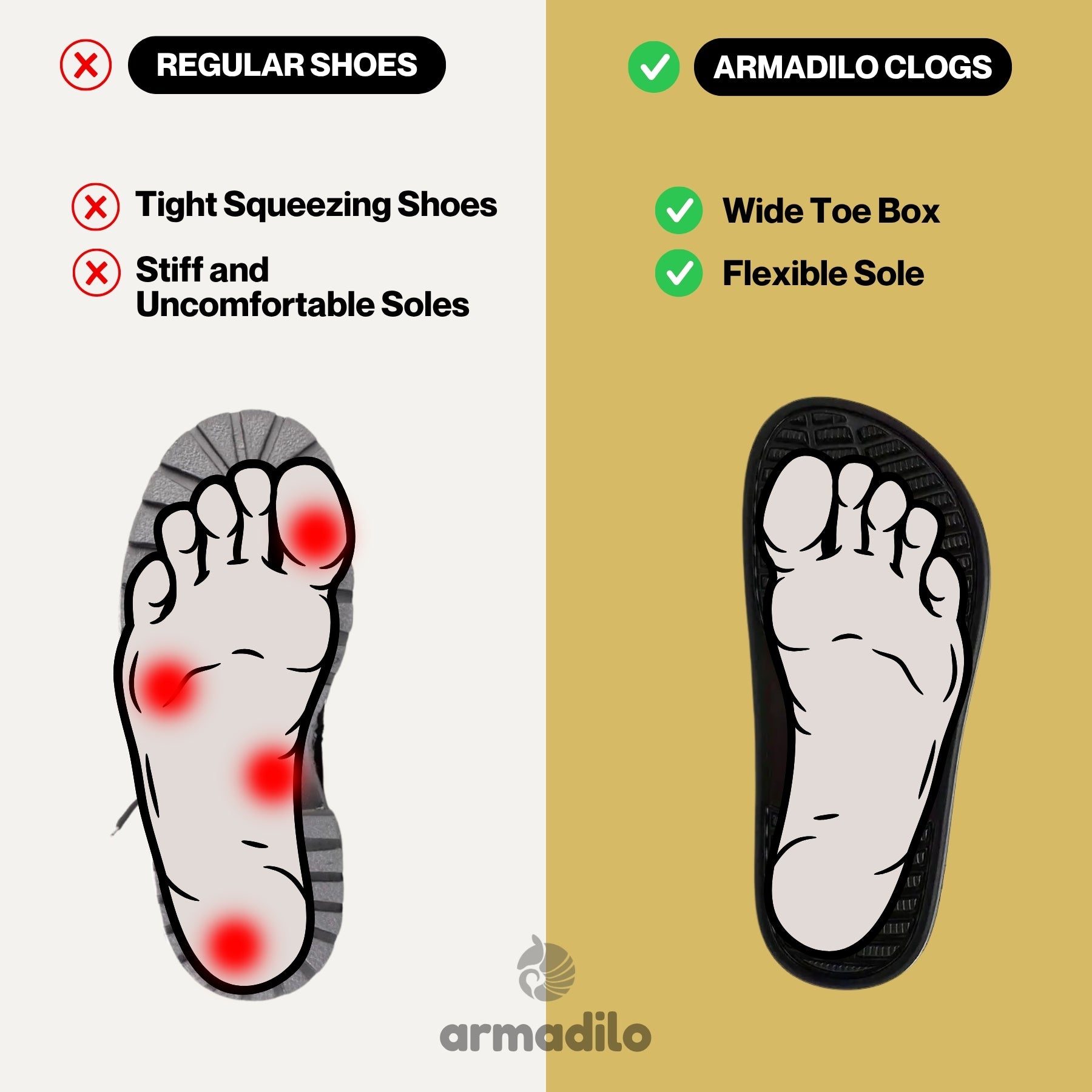 Our Armadilo Footwear clogs are thoughtfully designed for everyday wear, work, and outdoor activities, delivering exceptional comfort and support. Endorsed by orthopedic and podiatry experts for their ergonomic construction, these clogs are ideal for enhancing foot health and alleviating pain. Step confidently, knowing you're well-supported for both your adventures and your foot health.