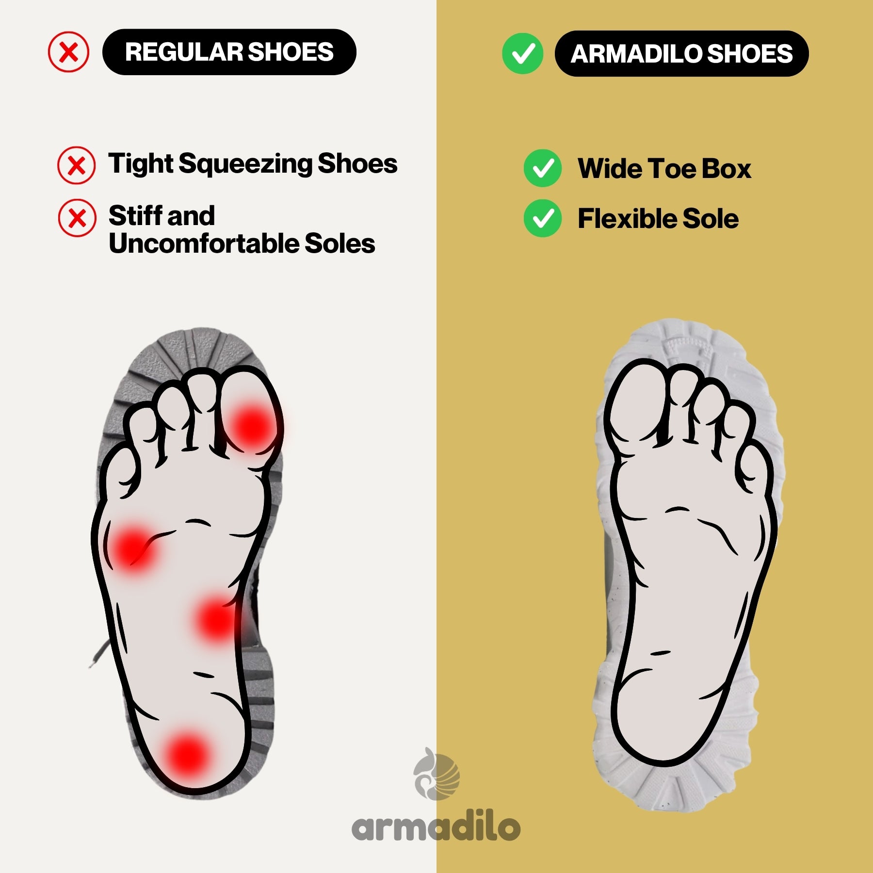 Our Armadilo sneakers are thoughtfully designed for everyday wear, work, and outdoor activities, delivering exceptional comfort and support. Endorsed by orthopedic and podiatry experts for their ergonomic construction, these sneakers are ideal for enhancing foot health and alleviating pain. Step confidently, knowing you're well-supported for both your adventures and your foot health.